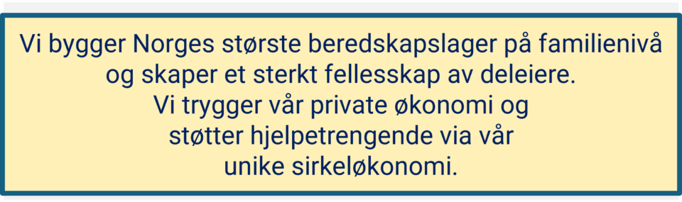 Nivå 1 er vår åpne dør. Med én aksje i nettvarehuset til 300 kroner blir du deleier i et fellesskap som bygger trygghet – ikke bare for deg selv, men for alle som er med. Du trenger ikke gjøre noe mer enn å bygge opp ditt eget beredskapslager ved å handle holdbare matvarer for 300 kroner i måneden. Litt etter litt vokser lageret ditt, og når fellesskapet begynner å skape inntekter, vil disse dekke din månedlige handel. Det betyr at tryggheten du bygger i dag, etter hvert vokser av seg selv – uten kostnad. Det er fellesskap i praksis.