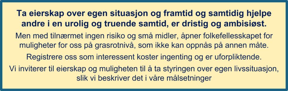 I dagens økonomi er familieøkonomien mer utsatt. Derfor lanserer vi folkefellesskapet som en trygg ressursplattform hvor familier kan drive en virksomhet uten risiko. Målet er høy selvforsyningsgrad uavhengig av samfunnets endringer, noe som krever stor skala for å sikre kapital til kriser. Folkefellesskapet organiserer slik storskala virksomhet for små familieenheter, som gir et betydelig vekstpotensial.