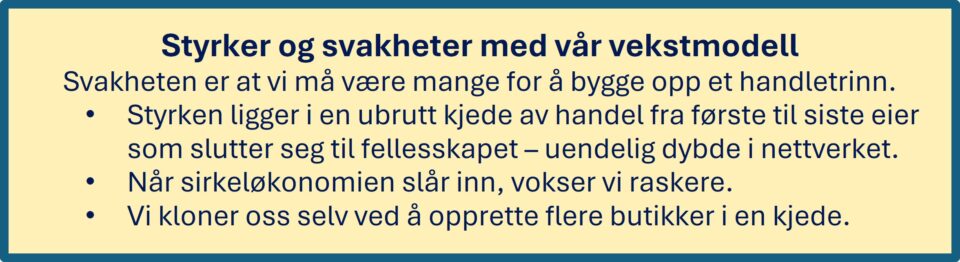 Denne formen for vekst går litt saktere, men er både tryggere og mer pålitelig enn andre modeller. Vi tar ingen unødvendig risiko, låner aldri penger og vokser i takt med hver nye eier som blir en del av fellesskapet. Derfor trenger vi mange nok eiere med fullt eierskap for å sikre at vi har både start- og driftskapital til å drive en solid og ansvarlig virksomhet fra dag én.