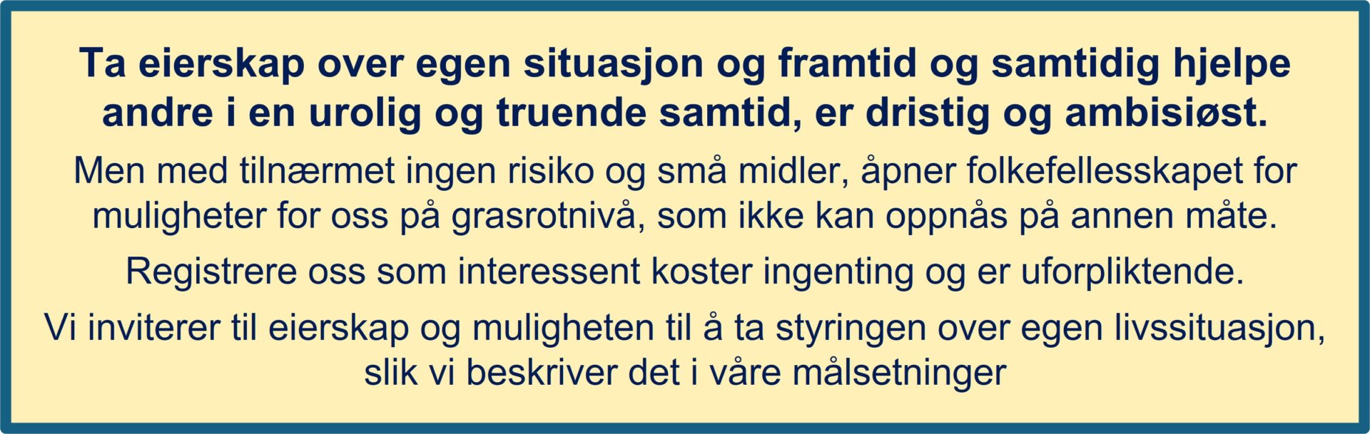 Med dagens samfunnsøkonomi blir familieøkonomien stadig mer utsatt. Derfor introduserer vi folkefellesskapet som en ressursplattform, der hver familie kan drive sin egen virksomhet trygt og uten risiko. Målet er å skape høy grad av selvhjulpenhet, uavhengig av samfunnets svingninger. Dette krever storskala virksomhet, ellers vil man ikke ha nok fordelingskapital til å håndtere kriser. Storskala virksomhet for små familieenheter organiseres innen rammene av folkefellesskapet, som beskrevet på side 1 i vår introduksjon. Gjennom folkefellesskapets storsatsing oppnår familier eller enkeltpersoner et stort potensiale, selv i en lien filial i nettvarehuset med bare 2 egne kunder pluss kundenes 4 kunder – Start nettverket!