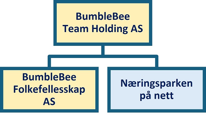 BumbleBee Folkefellesskap AS er vårt salgsselskap, og BumbleBee Team Holding AS er vår konsernspiss. Gjennom holdingselskapet kan vi dra nytte av fritaksmetoden, som betyr at selskapet kun betaler 0,66 prosent skatt på utbytteinntekter fra andre aksjeselskaper. Ordningen er begrunnet med at pengene ikke blir skattepliktige før de tas ut til privat bruk, for eksempel når aksjonærene får utbetalt utbyttet. En annen fordel er at utbyttet kan reinvesteres skattefritt i nye selskaper eller prosjekter. Holdingselskapet fungerer som vår «sparegris».