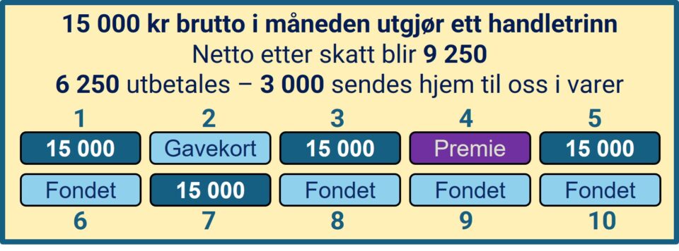 Av den maksimale inntekten på 10 handletrinn, som illustrert i plansjen over, beholder vi 4, overfører ett til vår mentor og tilbakefører 5 til kundekolleger etter oss. Vi beholder 40 %, overfører 50 % til spleisefondet, mens 10 % går til mentor. Dette betyr at du selv mottar en premiaksje for alle som registrerer seg i ditt navn når de har bygget opp 4 handletrinn i sin eierkonto i fellesskapet og/eller internettbutikk.