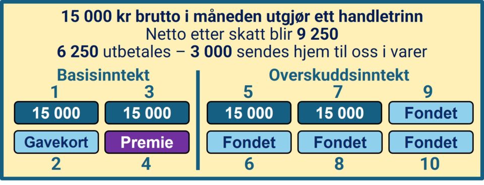Av den totale inntekten på 10 handletrinn, som vist i plansjen, beholder vi selv 4, henholdsvis trinn 1, 3, 5 og 7. De øvrige trinnene overføres til spleisefondet og fordeles gjennom sirkeløkonomiens hjelpeprogram, bortsett fra premietrinnet som går til vår mentor. Vi beholder 40 %, overfører 50 % til spleisefondet, og 10 % går til mentor.